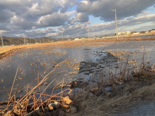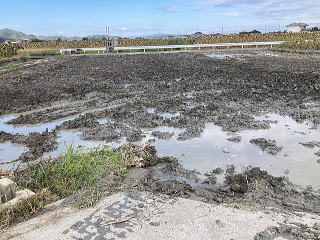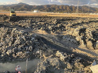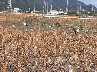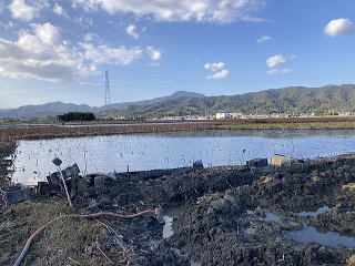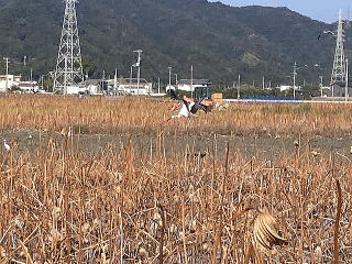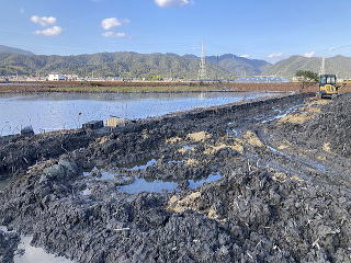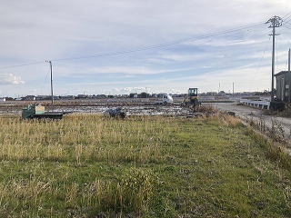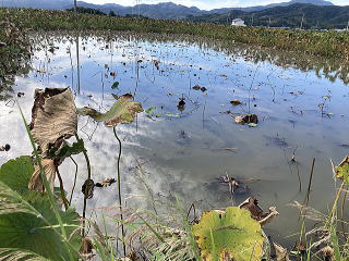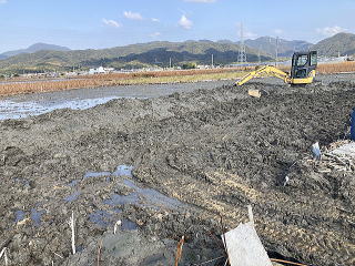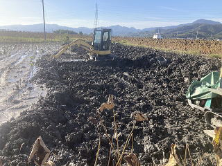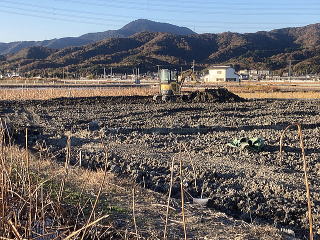 ユンボで上の土を取り除き自由に生育した蓮根を収穫します。左右上下にある蓮根を熊手とスキを
